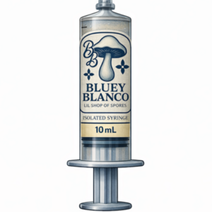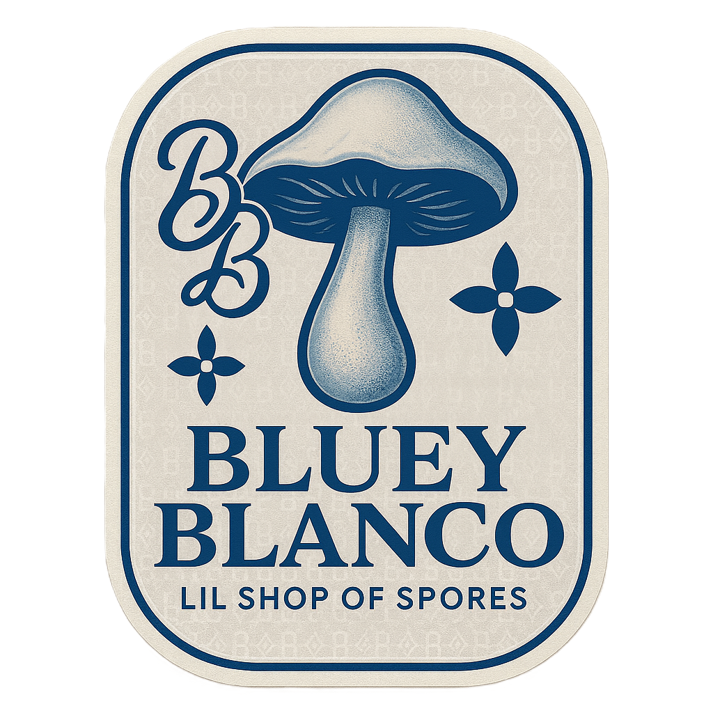 Psilocybe cubensis Bluey Blanco is an albino variant of the Bluey Vuitton strain, selectively stabilized for reduced pigmentation while maintaining classic P. cubensis morphology. The strain exhibits pale ivory to off-white basidiomes with minimal melanin expression and characteristic blue bruising when handled.